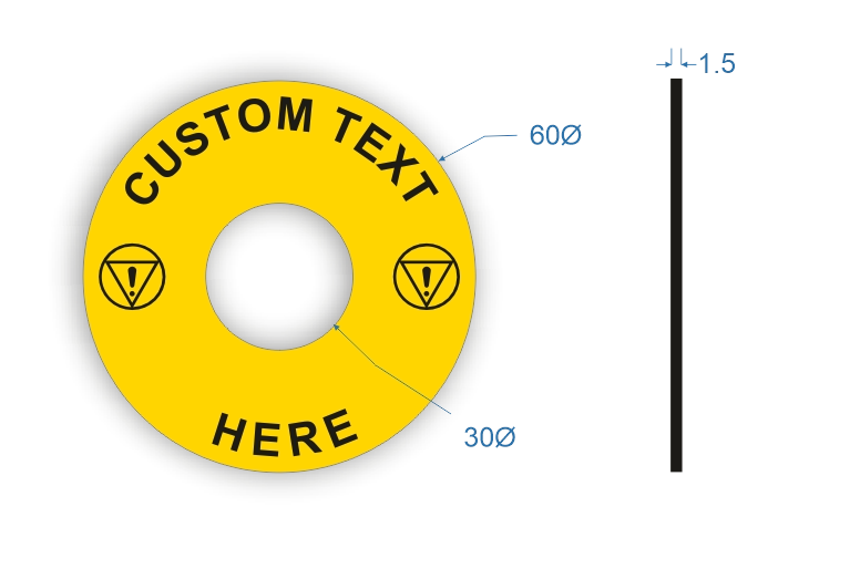 Custom wording Emergency Stop Labels , 60mm diameter outer 22.5mm inter daimeter Traffolyte Yellow/black/yellow 1.5mm thick. Pack of 10 Self-adhesive